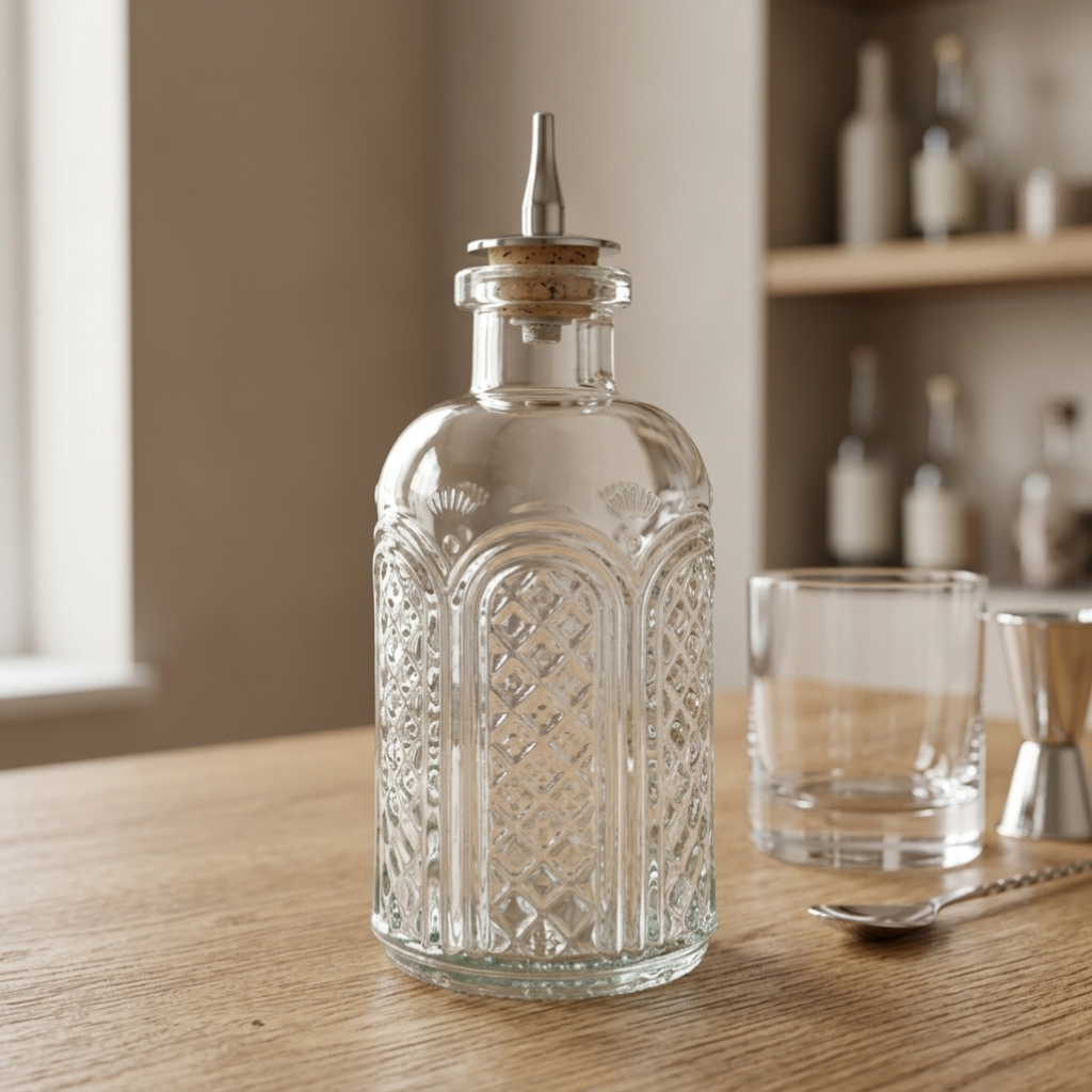 Een vintage bitters bottle van glas voor het stijlvol doseren van bitters, rinse of andere kleine cocktailaccenten. Geen basistool, maar een verfijnde toevoeging voor liefhebbers die afwerking en barpresentatie serieus nemen.