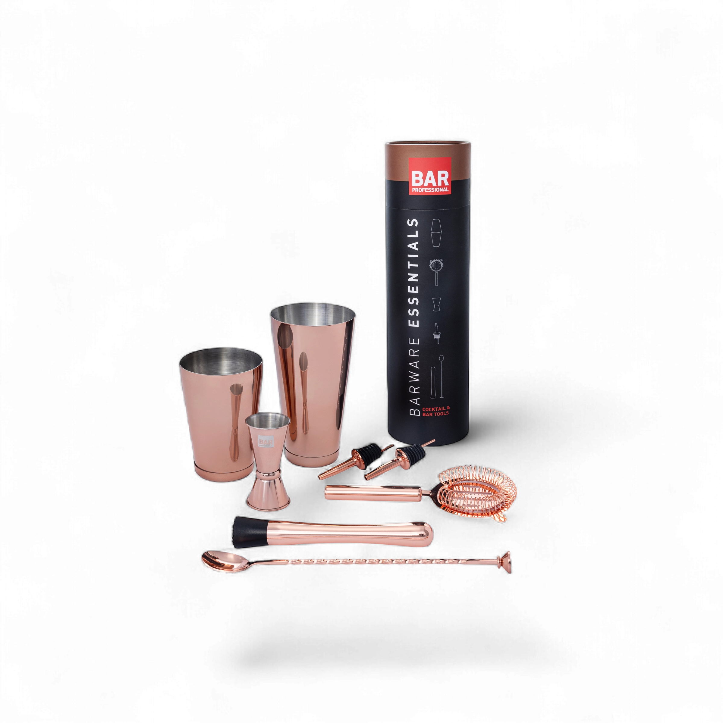 Complete cocktail bartool set in koperkleurige uitvoering, geleverd in een luxe koker.