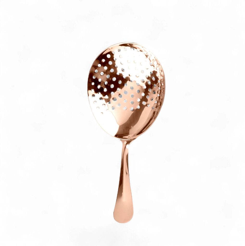 Een klassieke julep strainer met copper finish voor het gecontroleerd uitschenken van stirred cocktails uit een mixing glass. Een verfijnde bartool met meer warmte, meer karakter en een rijkere uitstraling achter de bar.