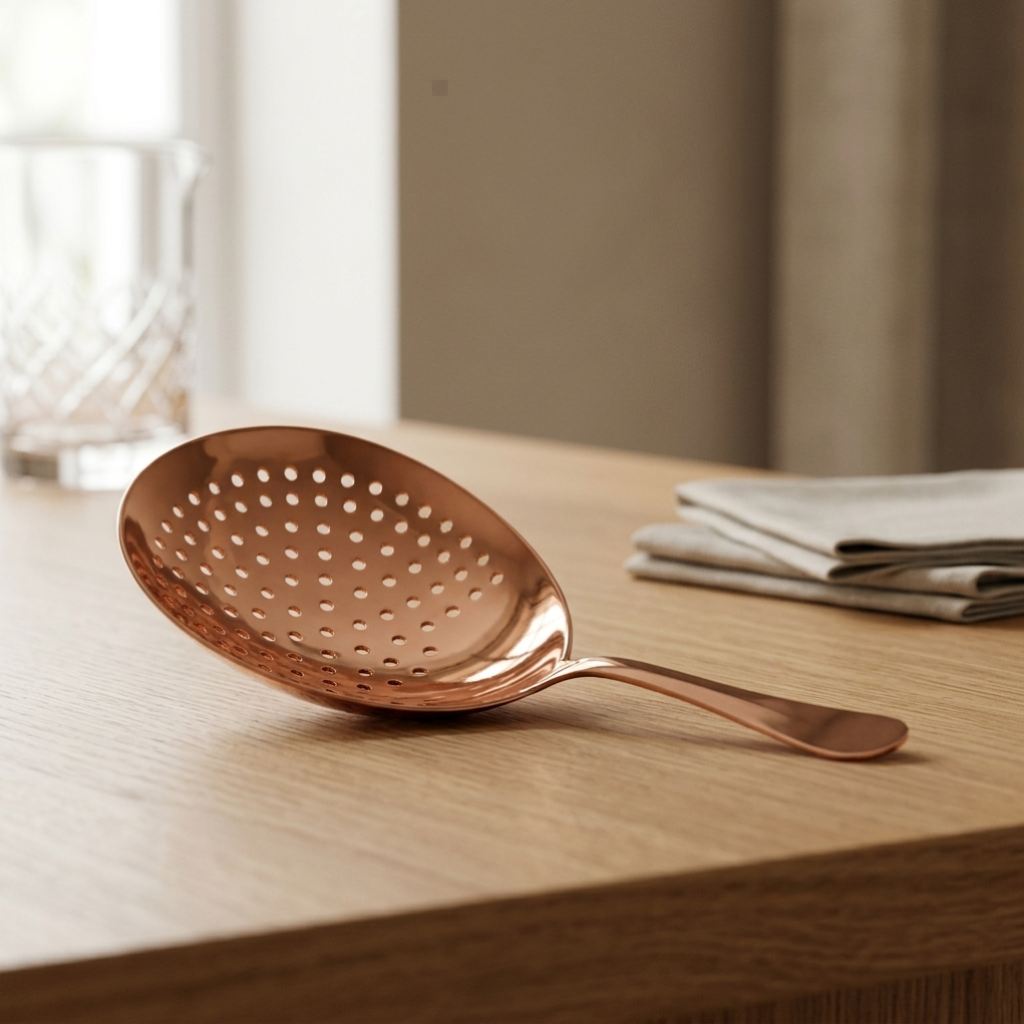 Een goede cocktail vraagt niet alleen om de juiste ingrediënten, maar ook om de juiste techniek. Deze Julep Strainer Copper is bedoeld voor het gecontroleerd uitschenken van stirred cocktails uit een mixing glass, zodat ijs en ongewenste resten achterblijven en de serve schoon in het glas terechtkomt, maar dan met een warmere en rijkere uitstraling dan de stainless uitvoering.