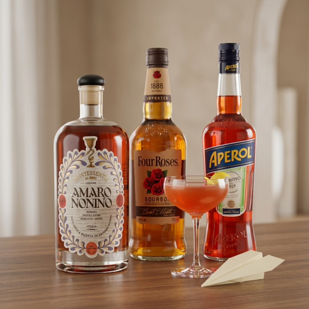 De Paper Plane is een moderne klassieker met vier gelijke delen, heldere citrus en kruidige diepte.